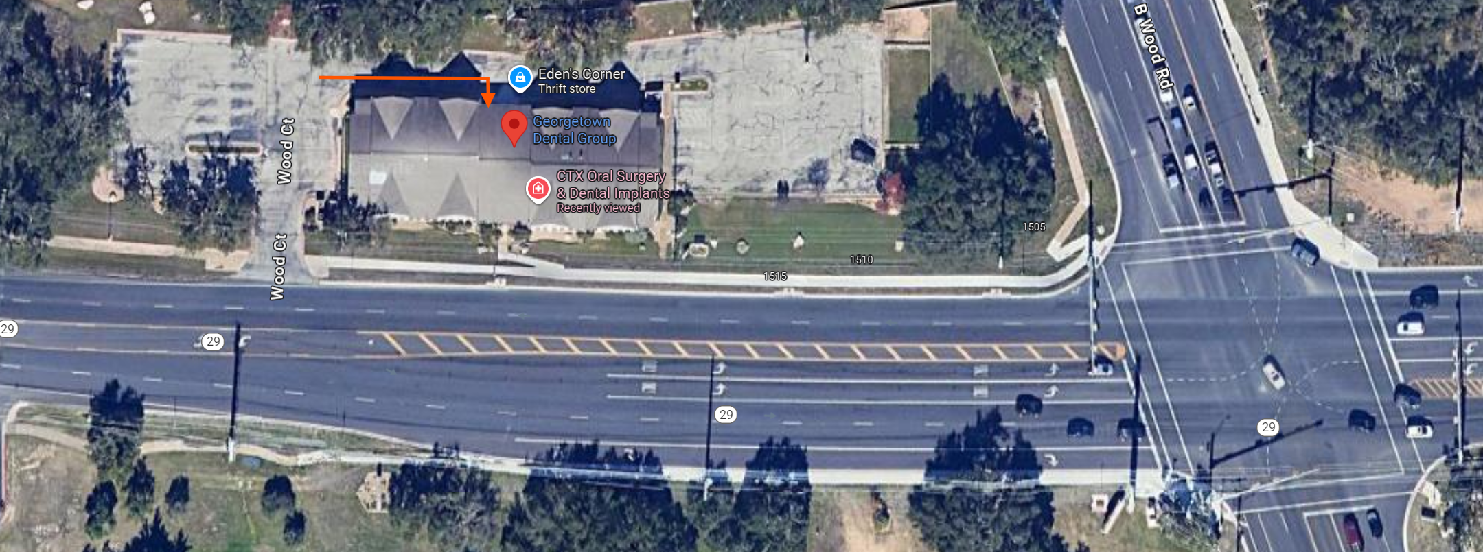 Park in the parking lot closest to the entrance. Our entrance is about 20 feet from the parking lot, along the sidewalk. See the orange arrow below: